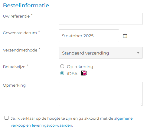 Plaats een bestelling zoals u altijd doet, en klik in stap 2 in de winkelwagen de betaalmethode Ideal aan. Vervolgens handelt u de bestelling af zoals gebruikelijk.