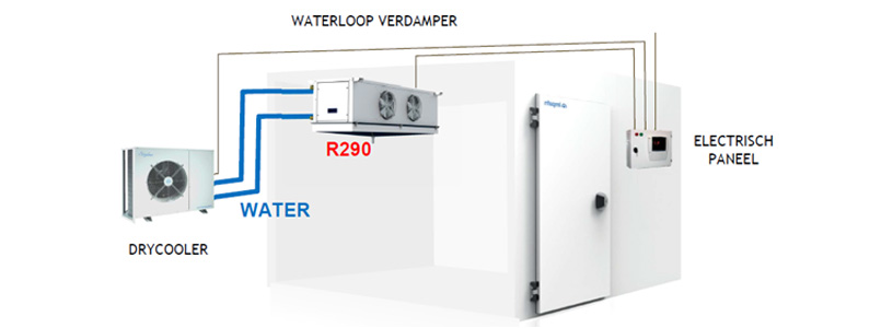 De “Waterloop luchtkoeler unit” is compleet met compressor, platenwisselaar, expansieventiel en watergekoelde condensor ( in een separaat geluidsgeïsoleerd compartiment ingebouwd ) en is speciaal ontwikkeld als kant en klare oplossing voor koel - en vriescellen.